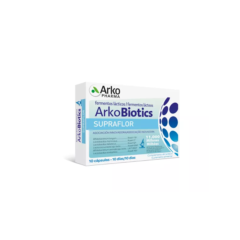 Arkobiotics® Supraflor es un complemento alimenticio a base de 6 cepas de fermentos lácticos (probióticos) 11.000 millones de UFC (Unidades Formadoras de Colonias) que contribuye a regenerar la flora intestinal.